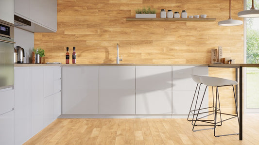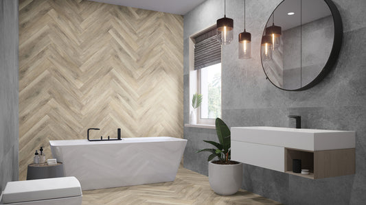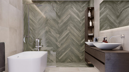 Die Tramonto-Fliese ist eine gesinterte Keramikfliese, die Holz imitiert. Geeignet für Außen- und Innenteile des Innenraums.