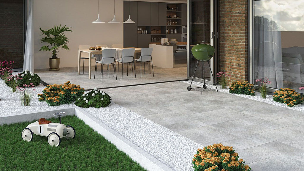 Eine schlichte, elegante Terrassenplatte mit Steinimitat, erhältlich in vier Farben.