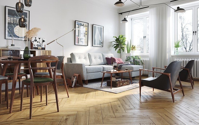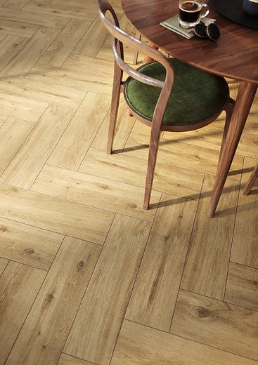 Im Fischmuster angeordnete Rohholzfliesen sind eine tolle Lösung für kleine und große Innenräume. Holzböden sind auch nach jahrzehntelanger Innovation nicht aus der Mode gekommen, da dieser Boden aus Keramik besteht, aber die Imitation der Holzstruktur so perfekt ist, dass selbst in dünnen Socken kein Besucher den Unterschied bemerken wird.