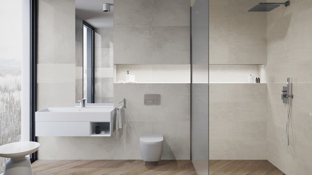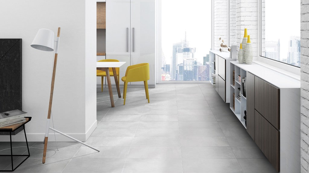 Pflaster Tassero bianco Rect. 59,7 x 119,7. Dank ihres klaren Industriedesigns und vier Farbtönen passen sich die rektifizierten Fliesen von Tassero nahezu jedem Raum an. Wir liefern auch als Treppenstufen und Sockel.