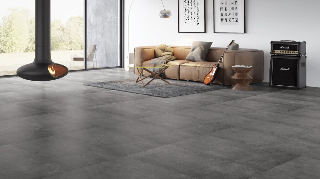 Pflaster Tassero Graphit Rect. 59,7x59,7 . Dank ihres klaren Industriedesigns und vier Farbtönen passen sich die rektifizierten Fliesen von Tassero nahezu jedem Raum an. Wir liefern auch als Treppenstufen und Sockel.